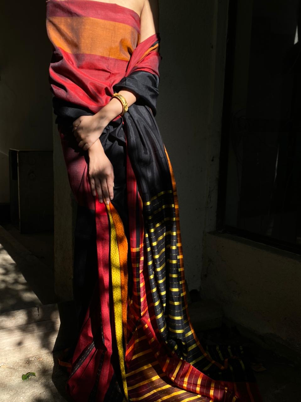 Black And Ash Stripe With Black Tussar Handloom Saree
