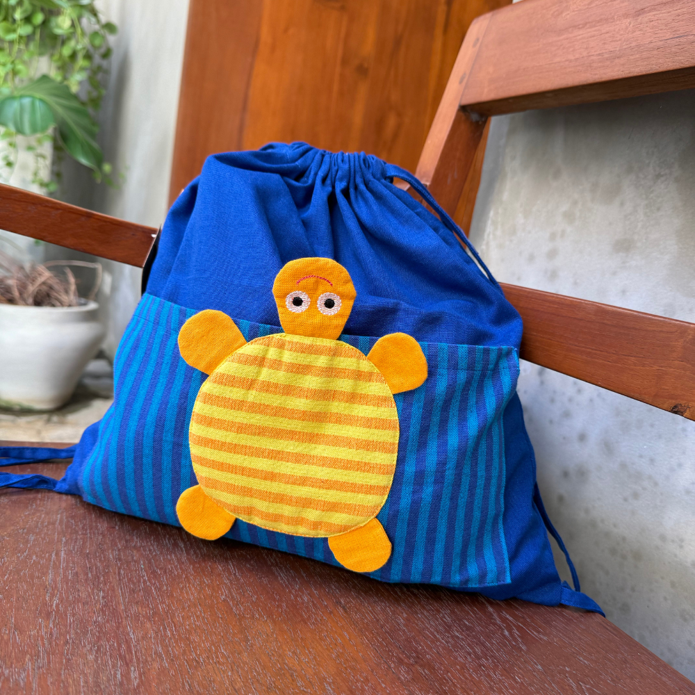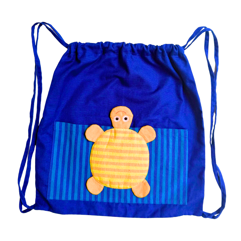 Bright, fun, and eco-friendly - our turtle drawstring bag is the perfect companion for kids. Handmade from soft handloom cotton, it features a playful turtle applique on the front pocket, adding charm and character to the bag.