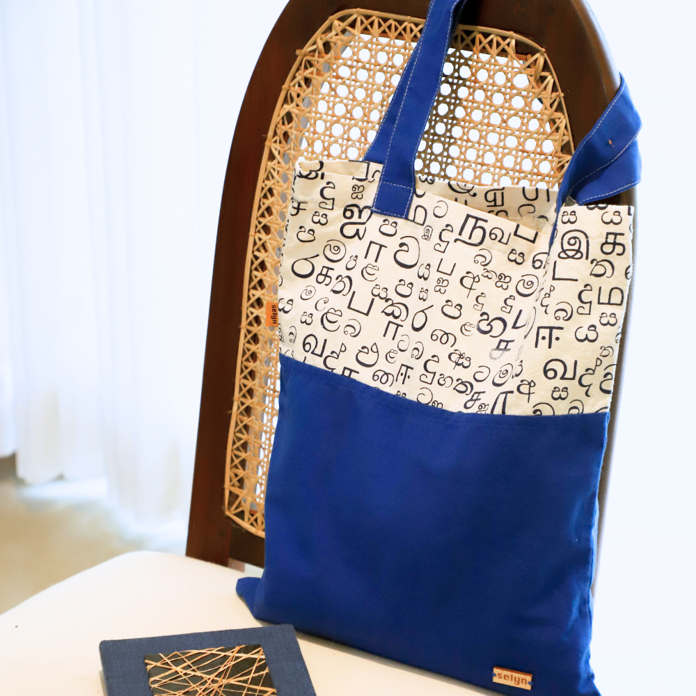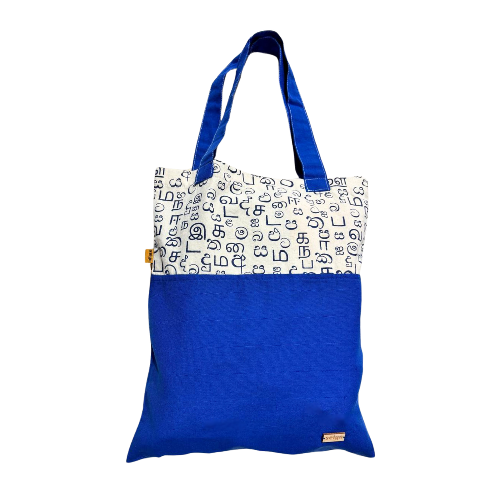 Blue & White Akuru Tote Bag – Sinhala & Tamil Script Design