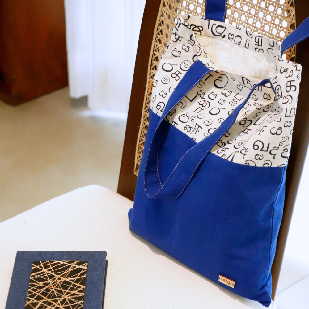 This handcrafted tote bag features vibrant handloom cotton in royal blue, beautifully contrasted with a white panel adorned in traditional Sinhala and Tamil Letters. Ethically made and sustainably woven, it's the perfect everyday bag for shopping, gifting, or travel.